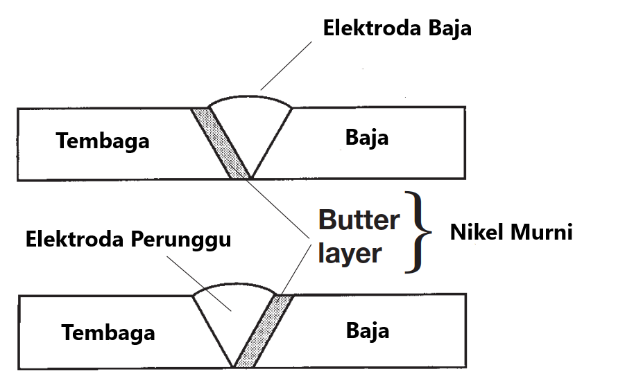 Dalam kedua kasus tersebut, elektroda nikel murni OK 92.05 dapat digunakan. Untuk final pengisian sambungan, elektroda dari jenis baja / stainless atau jenis perunggu bisa digunakan, tergantung pada sisi mana lapisan mentega diterapkan. Gambar berikut menunjukkan bagaimana lapisan mentega ini dapat dilakukan.